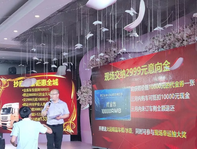接下来,大运重卡东北大区经理张申上台为在座嘉宾做详细讲解。张经理介绍道,大运重卡不仅在营口地区已经排名第三,在全国范围的牵引车市场上也已经排名第六,未来发展潜力巨大。大运重卡外观造型线条流畅、美观时尚,配置细节彰显人性化,安全性更被行业公认。大运康明斯品系享受整车三年质保、停运补偿、代用车服务,三年之后终身质等保售后服务。同时还解读了现场订车倾情钜惠,现场观众纷纷赞叹优惠力度之大。