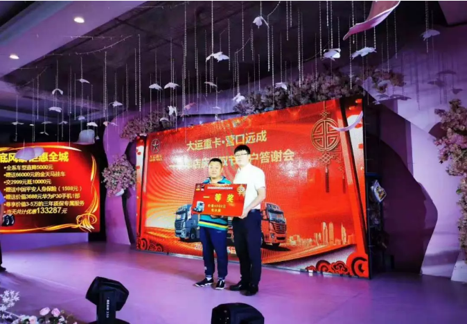 最后,在大家期待中,激动人心的时刻到了,一等奖1名最终揭晓,奖品为价值4999元双开门冰箱,由大运重卡东北大区经理张申为中奖客户颁发。